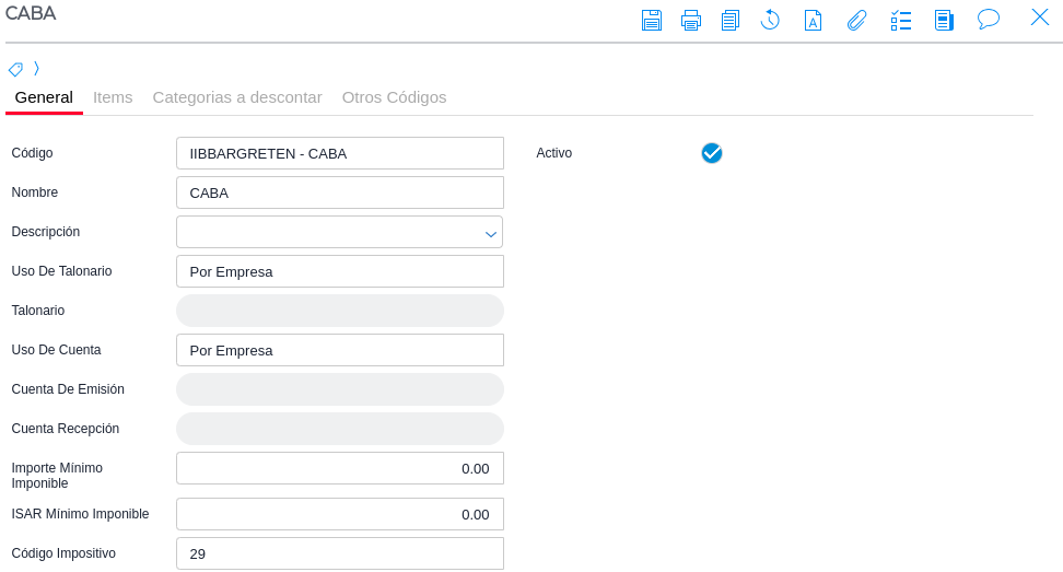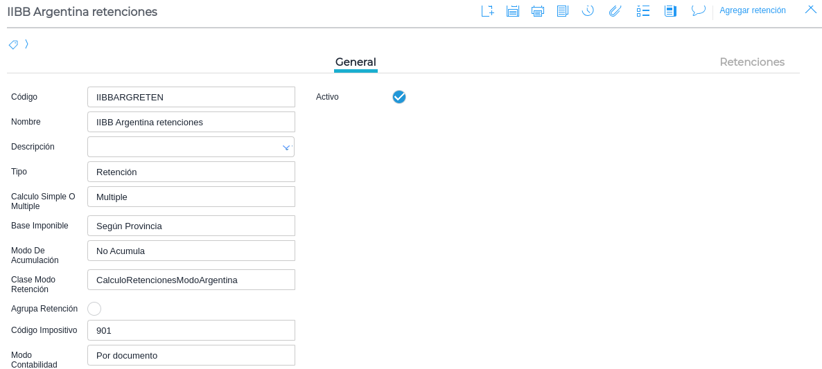 Activo: indica si el tipo de retención creado se encuentra o no disponible para su selección y utilización en nuevas transacciones o en los maestros de configuración que lo requieran.