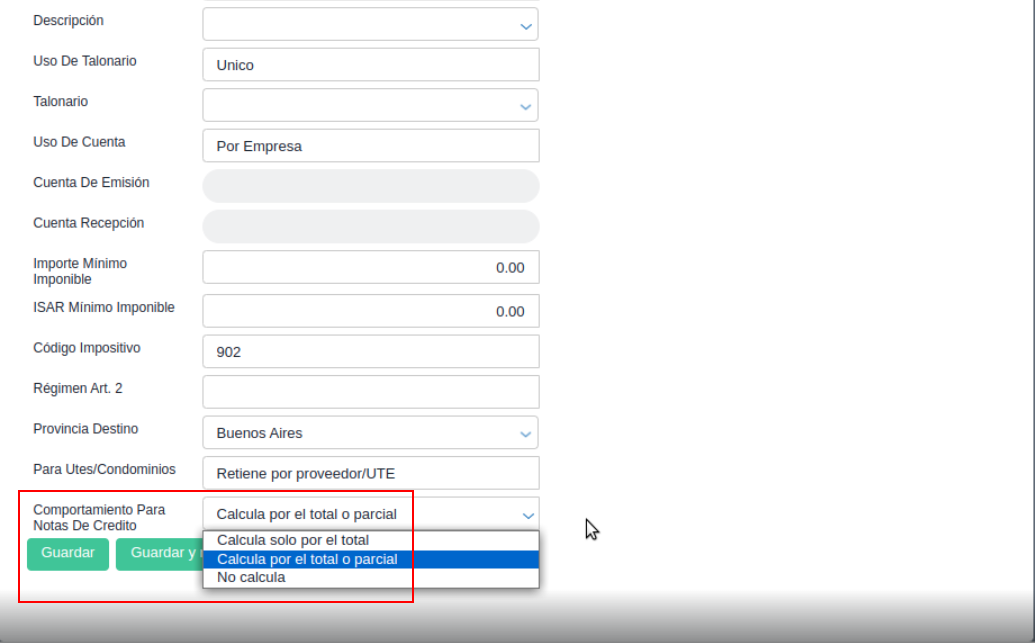 Clase modo retención: el valor de este atributo se genera automáticamente y no debe editarse. Para el nuevo motor es CalculoRetencionesModoArgentina.