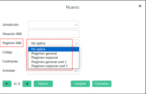 Régimen IIBB: contiene las siguientes opciones: