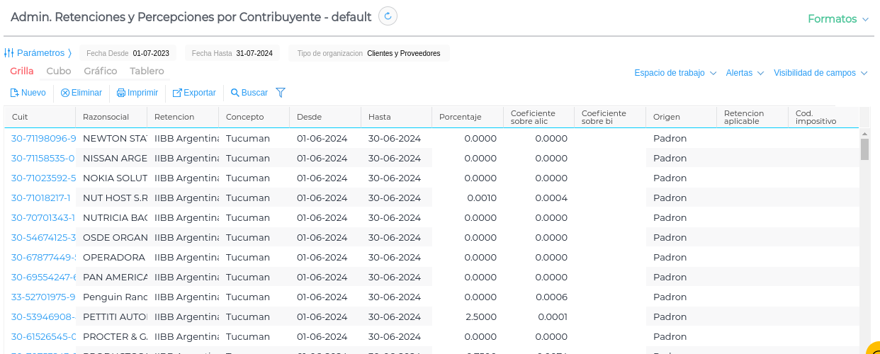 Los registros estándar con “% Porcentaje” en 0 indican que la alícuota vendrá informada por padrón (los registros de padrón se encuentran en la view “Admin. Retenciones y Percepciones por Contribuyente”).