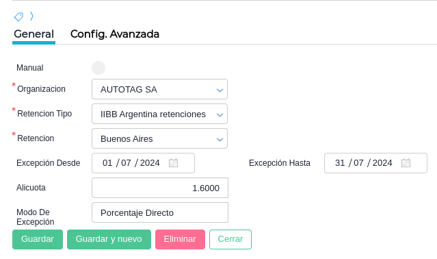Alícuota: indica el porcentaje a aplicar para determinar el importe de retención o percepción. La forma en que se aplique depende del modo de excepción seleccionado. En caso de que quiera cargarse alguna exclusión, debe colocarse como porcentaje 0.00.