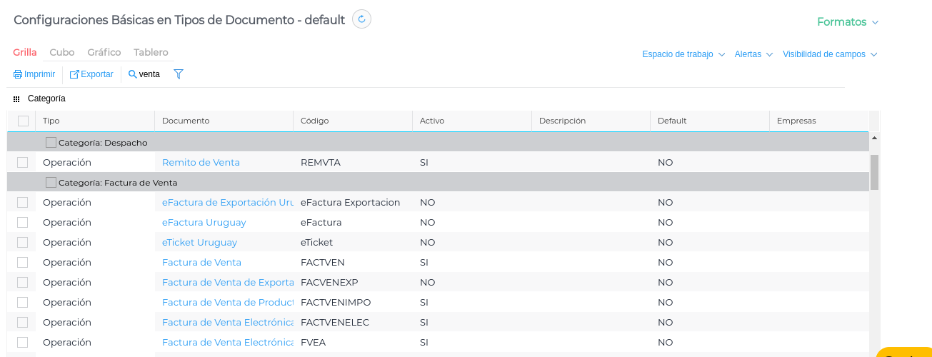 Se selecciona el documento a configurar (solo documentos de tipo Operación):