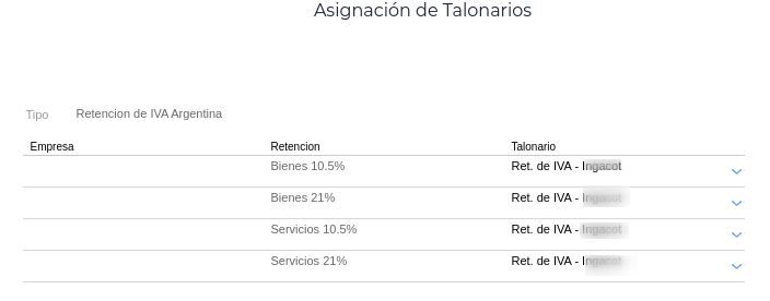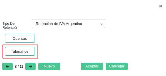 Para configurar los Talonarios se clickea el botón Talonarios del registro “Retencion de IVA Argentina” y para cada régimen de retención se selecciona el talonario que se desea asociar con las transacciones.