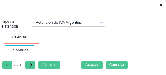 Al ingresar a cada uno de estos registros se podrán configurar las cuentas que impactan en la retención/percepción efectuadas y sufridas y el talonario que se usa en retenciones efectuadas.