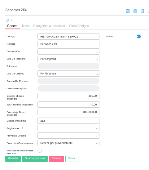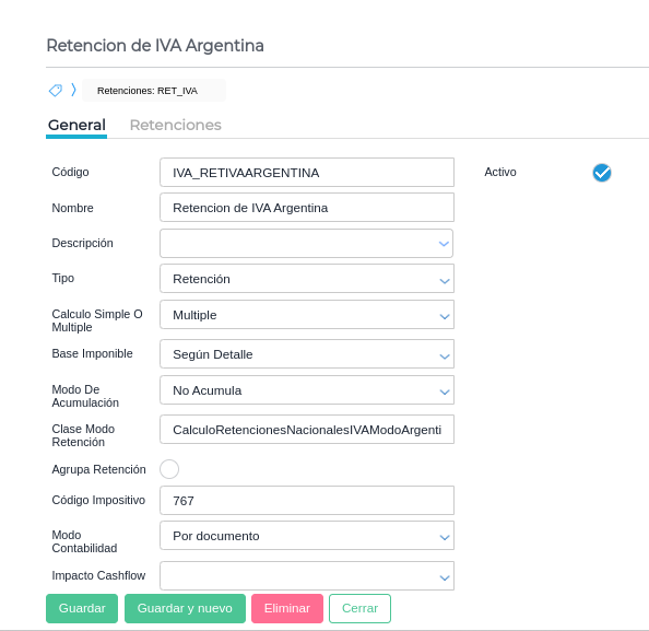 Activo: indica si el tipo de retención creado se encuentra o no disponible para su selección y utilización en nuevas transacciones o en los maestros de configuración que lo requieran.
