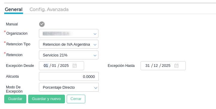 Alícuota: indica el porcentaje a aplicar para determinar el importe de retención o percepción. La forma en que se aplique depende del modo de excepción seleccionado. En caso de que quiera cargarse alguna exclusión, debe colocarse como porcentaje 0.00.