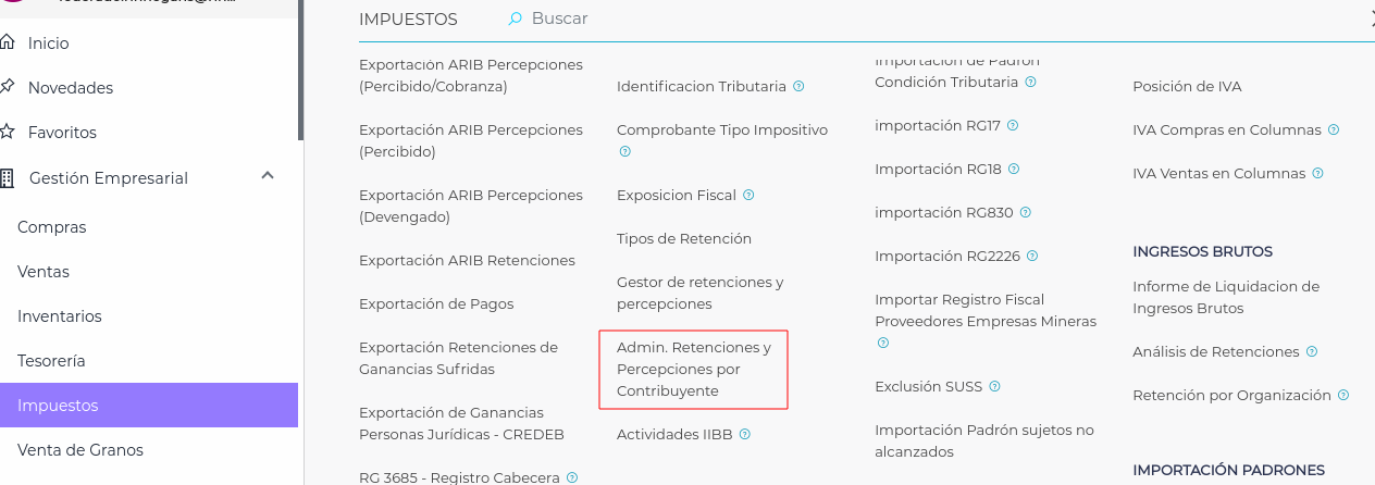 Gestión Empresarial → Impuestos → Maestros → Admin. Retenciones y Percepciones por Contribuyente