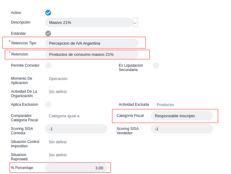 - Rentención: indica el régimen de Retención. A los fines de generar la retención/percepción en las transacciones, el dato de este campo se compara con el campo