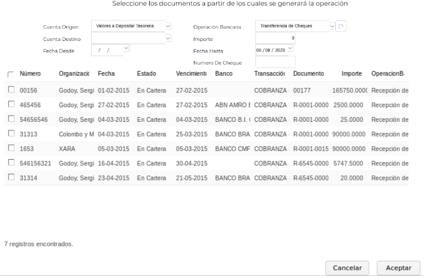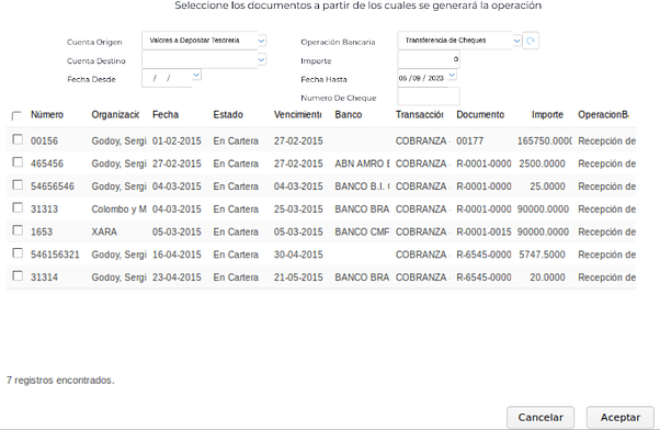 En caso de utilizar una operación bancaria que no precise el campo Importe, se refresca y la grilla mostrará todos los cheques que estén disponibles para operar dentro de la cuenta seleccionada. Este comportamiento sigue siendo exactamente igual.