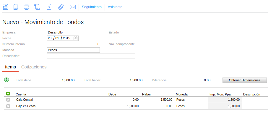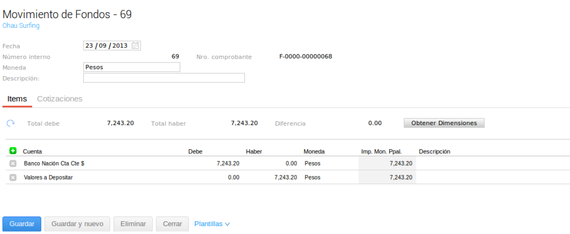 Los Movimientos de Fondos permiten realizar cualquier tipo de movimiento entre cuentas de disponibilidades como ser transferencias bancarias, depósitos de cheques o de cupones de tarjeta, registro de rechazos de cheques, reposición de fondos fijos, pasaje de cheques diferidos, extracción o depósito de efectivo, etc. *