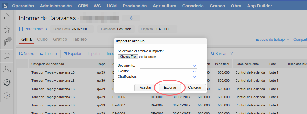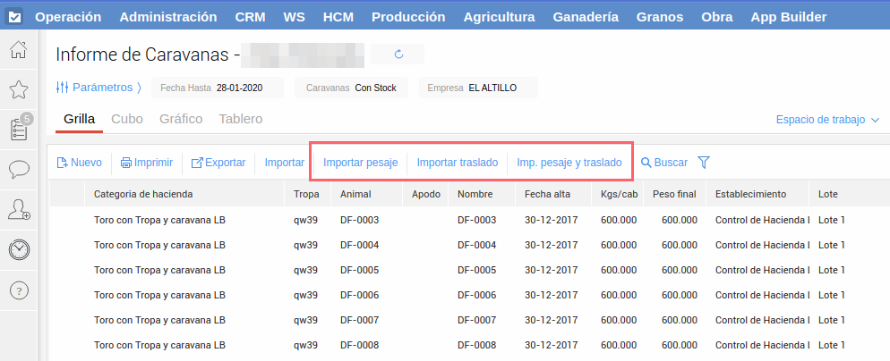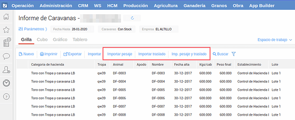 Desde el informe de caravanas tienes la posibilidad de importar pesajes, traslados, o ambos al mismo tiempo.