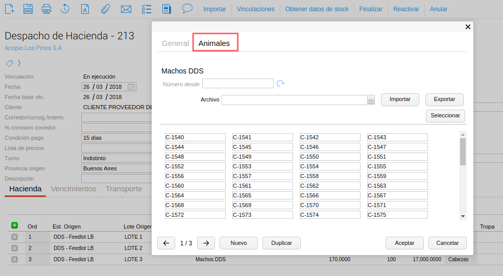 Al ingresar a cada una de las filas se pueden detallar los animales importados con sus correspondientes datos.