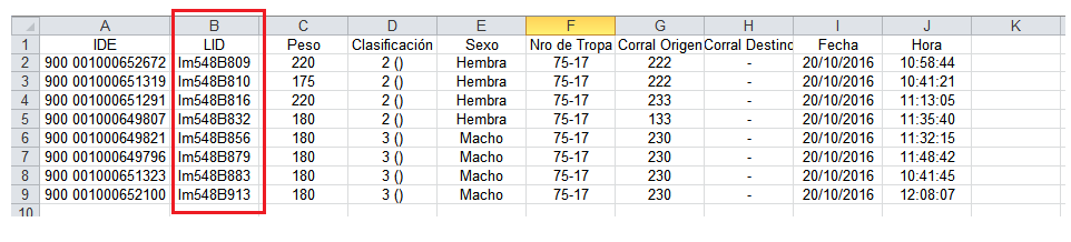 En la columna “B” del archivo generado por balanza Tru-test o xls se detalla el ID(caravana) de cada animal. Esta columna es importante, ya que, el sistema tomará esta información para identificar a cada uno de los animales: