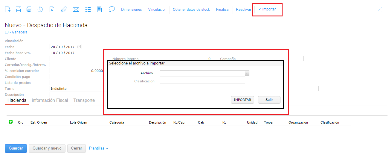 Al hacer clic sobre este botón se abre una ventana en la cual se podrá seleccionar el archivo xls que se desea importar y la clasificación del despacho (puede definirse por defecto). Los datos restantes necesarios para el registro de la transacción se obtendrán de cada animal involucrado, o del archivo generado por la balanza.