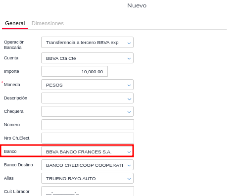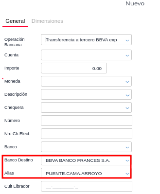 Quedarán visibles en el pop up los campos Banco Destino y Alias: