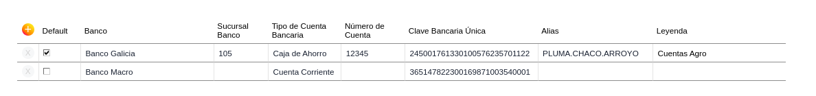 - Check: “Es default”. En caso de tildar este check al ejecutar una operación bancaria con dicho proveedor automáticamente el sistema deberá traer el cbu del proveedor establecido por default. A su vez, tendrá la posibilidad de elegir otro cbu que se encuentre cargado en dicho maestro. Solo se permite una cuenta bancaria default.