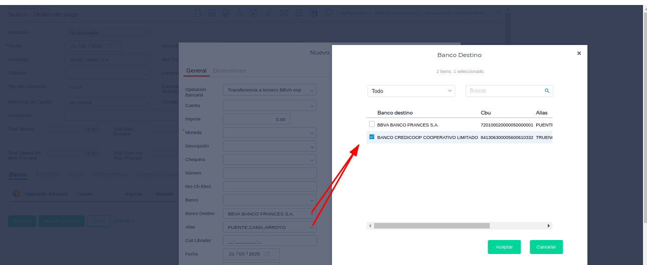 Por default se completará el banco y el alias de la cuenta indicada como default en el maestro de proveedores, pero desde cualquiera de los dos campos (banco destino y alias) se podrán visualizar el resto de las cuentas que tenga activa el proveedor, pudiendo elegir cualquiera de ellas: