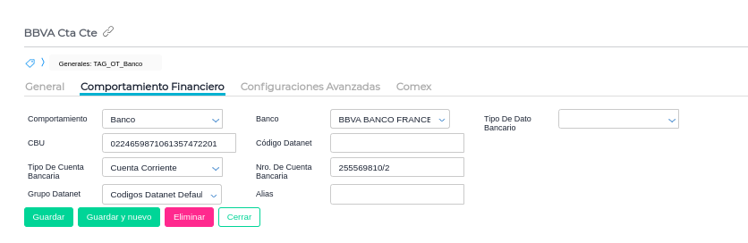 Para poder ver reflejado el pago luego en los exportadores de pagos, es necesario que en el plan de cuentas, en la cuenta contable correspondiente al banco de donde tendrá lugar el egreso de fondos, estén completos los datos de la solapa comportamiento financiero: