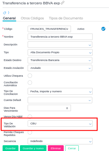 - Check: “Activo”. En caso de tildar dicho check se podrá desactivar los CBU que se encuentren en desuso, y así evitar confusiones al realizar las transacciones. Se deberá considerar que las cuentas que tenga el check de desactivado, no deberán ser visibles al realizar la transacción.