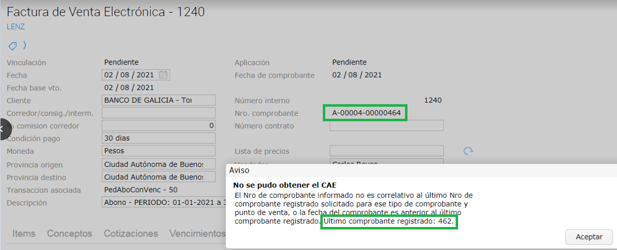 Al solicitar CAE sale este mensaje: “El Nro. de comprobante informado no es correlativo al último Nro. de comprobante registrado solicitado para ese tipo de comprobante y punto de venta, o la fecha del comprobante es anterior al último comprobante registrado 462”.