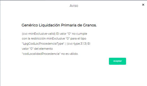 Al obtener el COE de la Liquidación Primaria de Compras de Granos aparece el siguiente aviso de error: