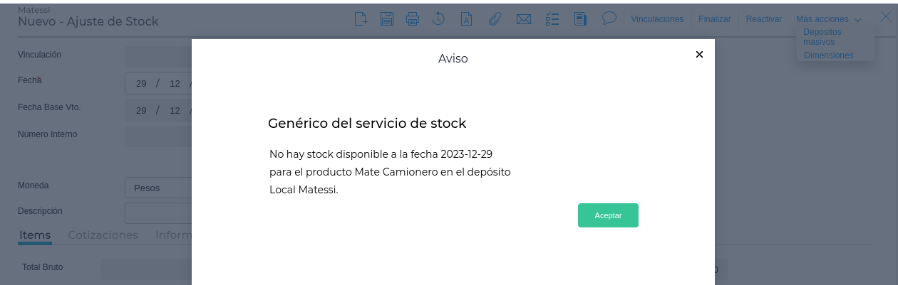No se puede realizar un ajuste de stock negativo. El sistema arroja el mensaje de “No hay stock a la fecha “xx” para el producto “xx” en el depósito “xx”.