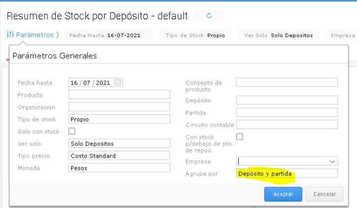 Consulta: No se pueden ver las partidas de los productos en el informe de Resumen de Stock por depósito.
