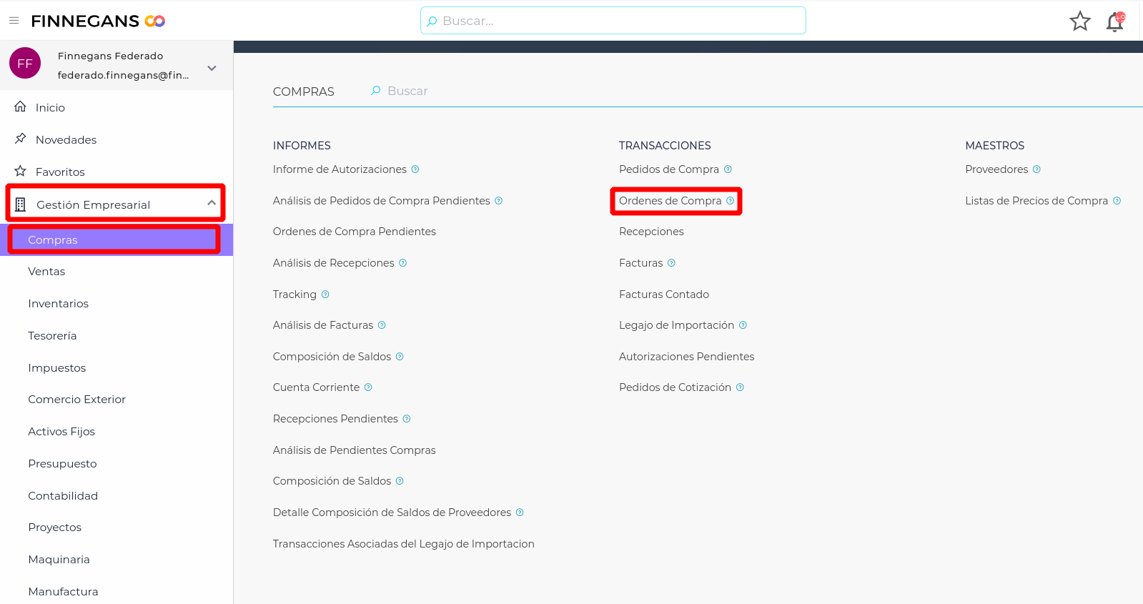 - Seleccionar la Orden de Compra correspondiente. Para ello, dirigirse a Menú > Gestión Empresarial > Compras > Transacciones > Órdenes de Compra