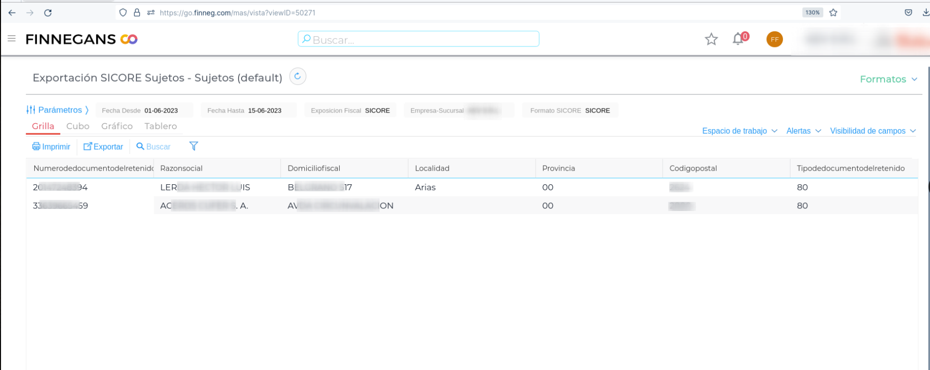 Vemos que, al consultar nuevamente el informe de Exportación SICORE - Sujetos, ahora el proveedor se visualiza correctamente