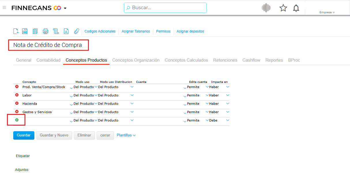 - Dentro del tipo de documento “Nota de Crédito”, ve a la solapa Conceptos Producto.