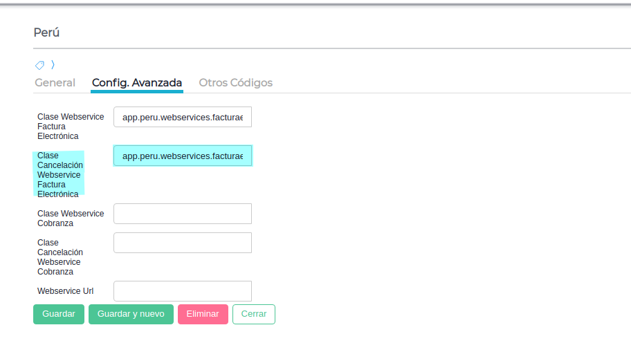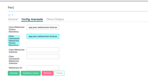 En la pestaña Configuración avanzada, en el campo Clase Cancelación Webservice Factura Electrónica se debe completar con: