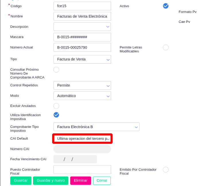 - En el campo CAI Default, cambia la opción de “Ultima operación del tercero para el talonario” a “No propone”.
