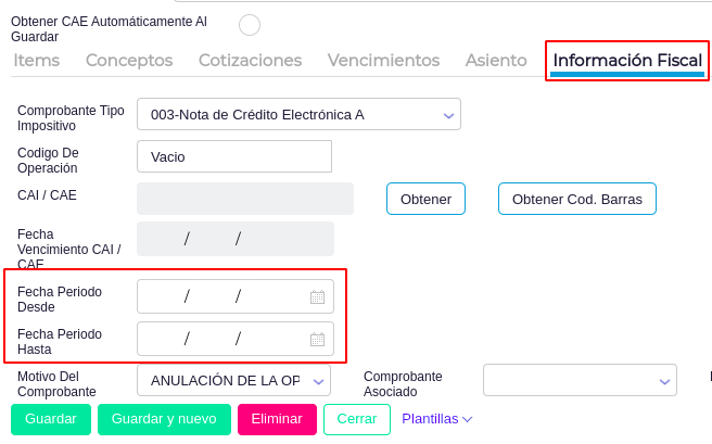 - Agregar en la solapa “Información Fiscal” la “Fecha Período desde” y “Fecha Período Hasta”.