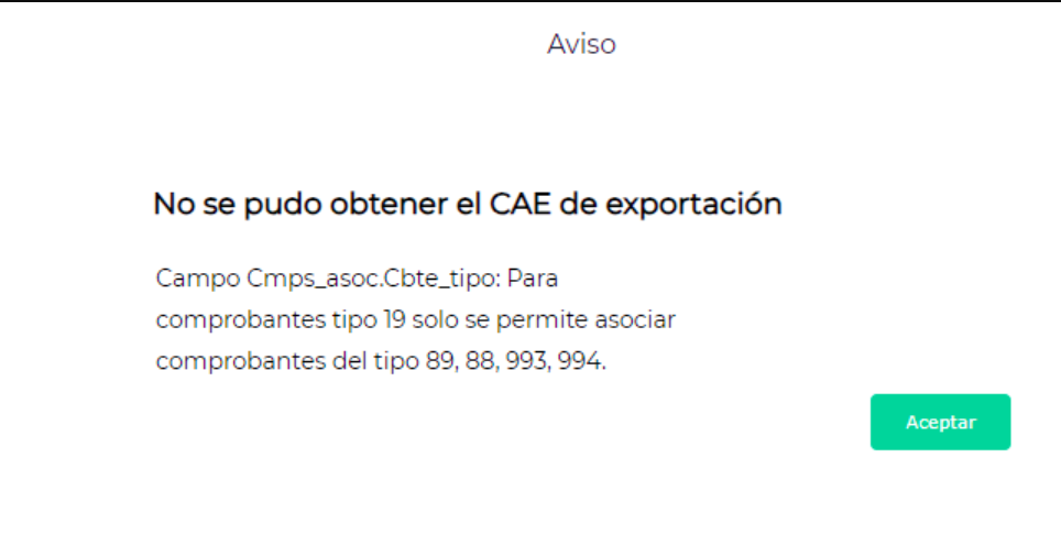 Consulta: Al solicitar CAE de una Factura de Venta Electronica de Exportacion sale el siguiente Aviso: No se pudo obtener el CAE de exportación.