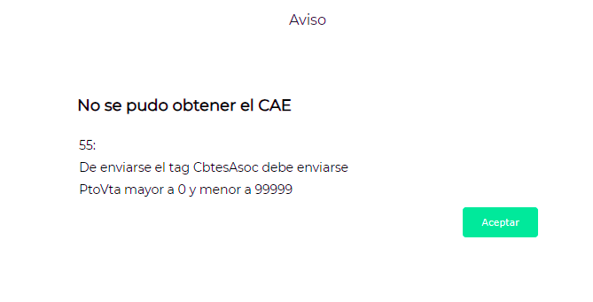 El sistema muestra el mensaje de advertencia “De enviarse el tag CbtesAsoc debe enviarse PtoVta mayor a 0 y menor a 99999” a la hora de obtener CAE de una Factura venta electrónica.