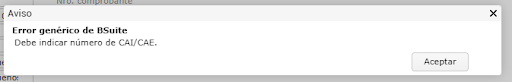 El mensaje aparece porque se tiene activado el check “Valida CAI/CAE” en el comprobante tipo impositivo utilizado en el talonario del documento.