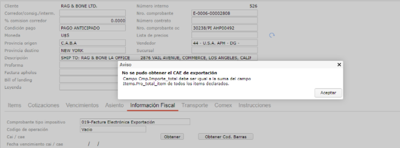 - Guardar el registro y volver a intentar la obtención de CAE en la factura de exportación.