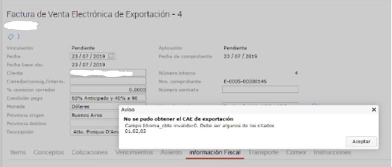 - Guardar el registro y volver a intentar la obtención de CAE en la factura de exportación.