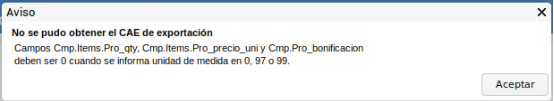 El sistema muestra el mensaje de advertencia “ No se pudo obtener el CAE de exportación. Campos Cmp.Items.Pro_qty, Cmp.Items.Pro_precio_uni y Cmp.Pro_bonificacion deben ser 0 cuando se informa unidad de medida en 0, 97 o 99.".