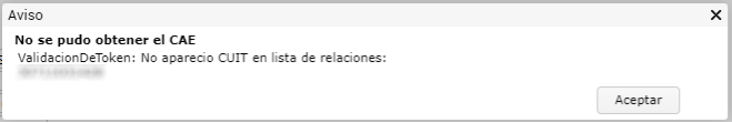 El sistema muestra el mensaje de advertencia “No se puede obtener CAE: ValidacionDeToken: No apareció CUIT en lista de relaciones”