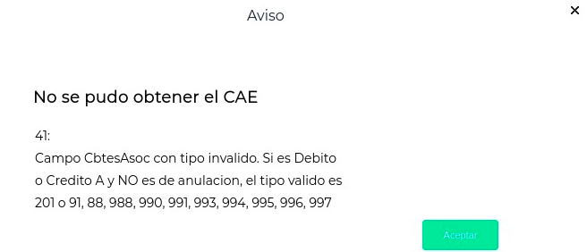 El mensaje dice que el comprobante asociado a la nota de crédito o de débito tiene que ser una factura.