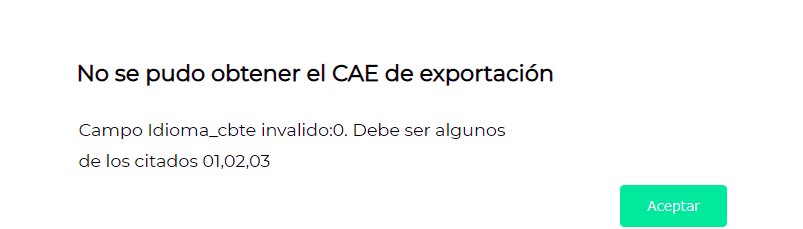 El sistema muestra el mensaje de advertencia “Campo idioma cbte inválido :0 Debe ser alguno de los citados 01,02,03” cuando se intenta emitir una factura electrónica de exportación.