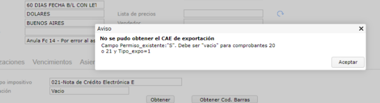 ” cuando se intenta obtener CAE de un documento de exportación.