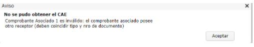 El sistema muestra el mensaje de advertencia “Comprobante Asociado 1 es inválido: el comprobante asociado posee otro receptor (debe coincidir tipo y numero de documento)" a la hora de obtener CAE de una nota de crédito.