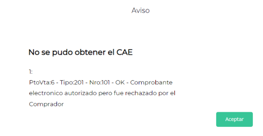 Se visualiza el siguiente mensaje de advertencia “Comprobante electrónico autorizado pero fue rechazado por el comprador” a la hora de obtener CAE de una nota de crédito o de débito.