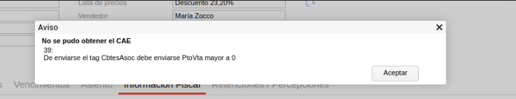 El sistema muestra el mensaje de advertencia “De enviarse el tag CbtesAsoc debe enviarse PtoVta mayor a 0” a la hora de obtener CAE en una nota de débito/crédito de ventas.