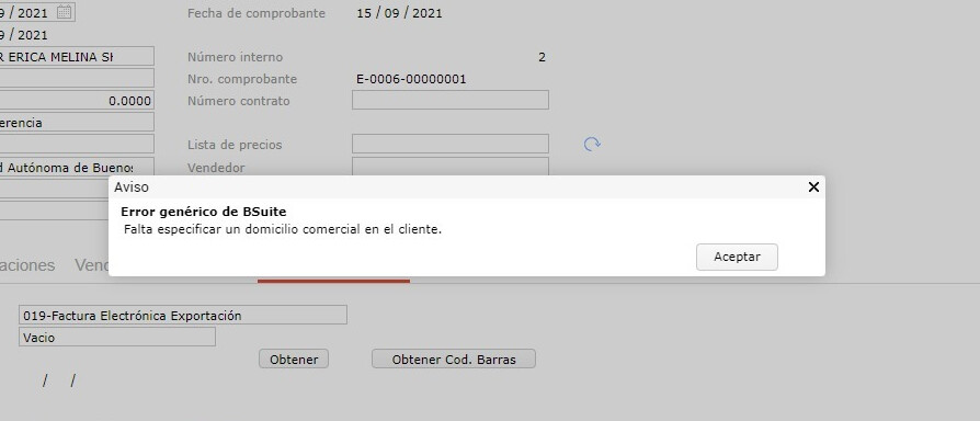 El sistema muestra el mensaje de advertencia “Falta especificar un domicilio comercial en el cliente" a la hora de obtener CAE de una factura de exportación.