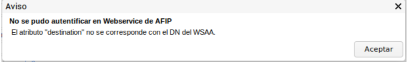 El sistema muestra el mensaje de advertencia “No se pudo autentificar el Webservice de AFIP. El atributo “destination” no se corresponde con el DN del WSAA” cuando se intenta obtener CAE de un documento.