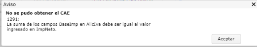 1291: La suma de los campos BaseImp en AlicIva debe ser igual al valor ingresado en ImpNeto." a la hora de obtener CAE de un documento electrónico.