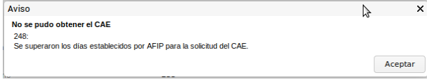 248: Se superaron los días establecidos por AFIP para la solicitud del CAE" a la hora de obtener CAE de un documento electrónico.